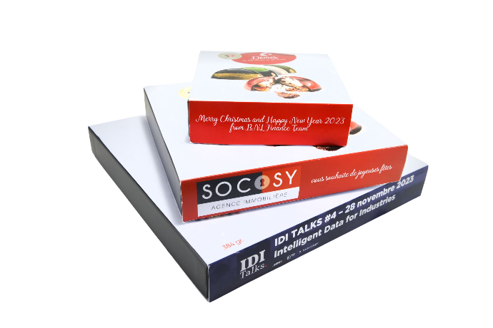 Ajoutez vos logos d'entreprise sur nos boites de Dômes et de pralines et proposez des cadeaux personnalisés à vos collaborateurs tout en bénéficiant d'une déduction.